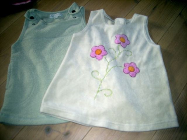 3. Spencere str. 68. Den grå-grønne er fra H&M og er i frotté, den med blomster er fra Stummer, og er i velour. Gode men brugte. 40 kr. for begge.