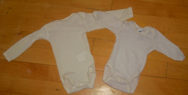 Billede 2: Uldbodyer str. 60 (56/62) De lyserøde, gråstribede og hvide er fra Joha, de rødstribede er fra Mads&Mette (Føtex). Alle er i 50% uld, 50% bomuld. I pæn stand