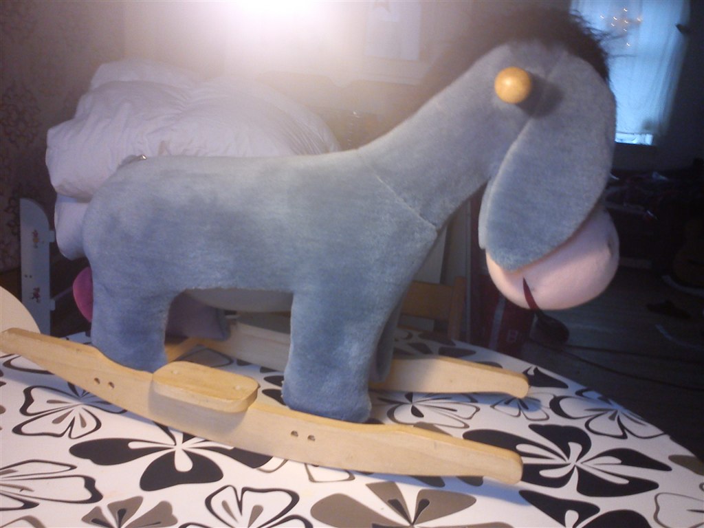 æsel gyngehest. god stand, dog har den under maven nogle ridser/ huller, men intet af betydning. det kun kostmetisk. lynlås helevejn under maven, plus halen er sat ekstra fast med en sikkerhedsnål da den jo falder af! kom gerne med bud. tror den vil være meget dyr at sende,gør det gerne, men modtager betaler omkosningerne