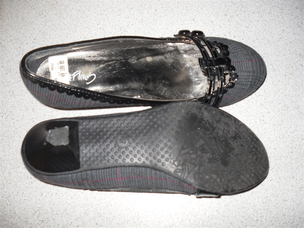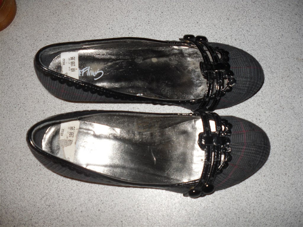 2. Endnu et par ballerina sko med lidt hæl på. Str 37. De er primært grå med noget tern i. De er umådeligt smukke! De er kun brugt to gange, i et kvarter ad gangen. På hælen kan det dog ses lidt, men den trænger ikke til at blive skiftet. Nyprisen er 200 kr. De sælges fordi de er købt for små!
