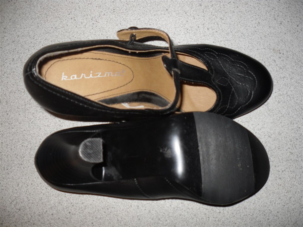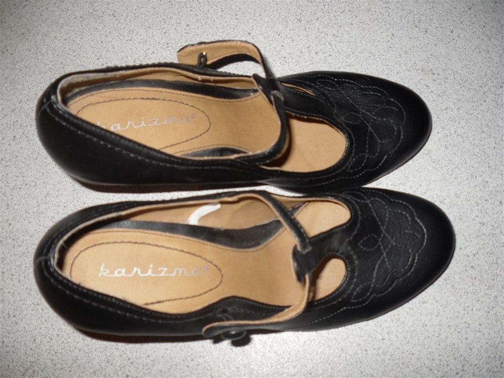 3. Stiletter i sort, hælen er en 7-8 cm. Størrelsen står der ikke, men det er cirka en 37, en lille 38. Der er et fint mønster på snuden, desuden er de en smule 30'er agtige. Skoene er aldrig brugt til en anledning, de er kun gået rundt i derhjemme, da jeg måtte erkende at de ikke passer til mine fødder der er alt for tynde til dem. Nyprisen huskes ikke.