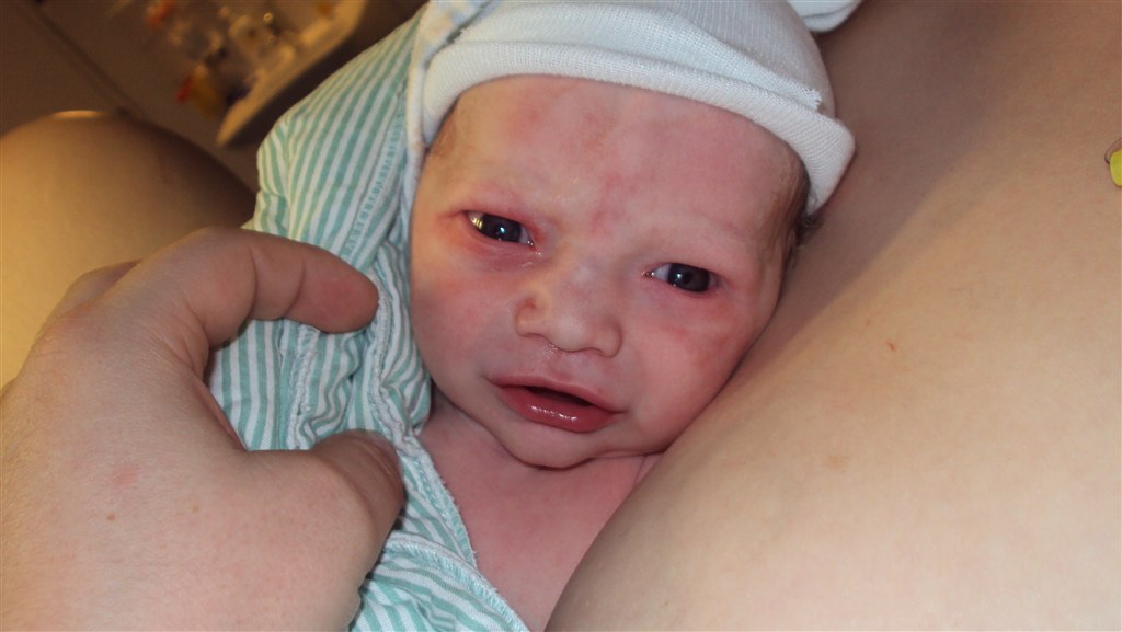 Så jeg kom på fødegangen og fik lagt ve-drop kl. 09:45 og kl. omkring 13:30/14:00 var jeg 6 cm åben og fik presseveer, men i mellem tiden fik jeg lagt blokade i ryggen, som kun tog toppen af de veer jeg havde