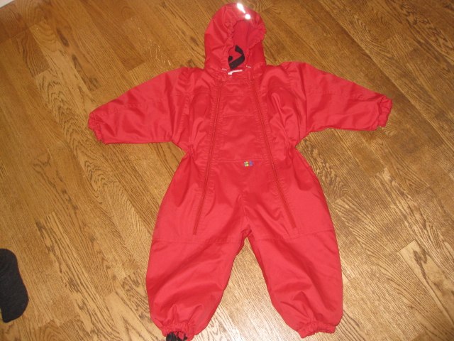 Flyverdragt fra Mikk Line str 2 år. Den er alm slidt, men ingen huller. Kunne kun lige finde en enkel plet nederst på det ene bukseben (se billede). Elastikken under det ene ben mangler (til at komme under støvlerne). Hatten kan spændes ind med elastik. Det er to lynlåse i, så barnet bedre kan komme i den, og der er vindfang øverst ved halsen bag lynlåsen.