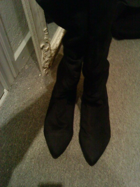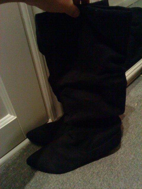 Nr. 1: Støvler med højt skaft i ruskinds lignende stof og fald ned effekt. Str. 40. Nypris 400 kr. Byd.