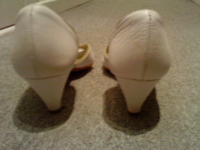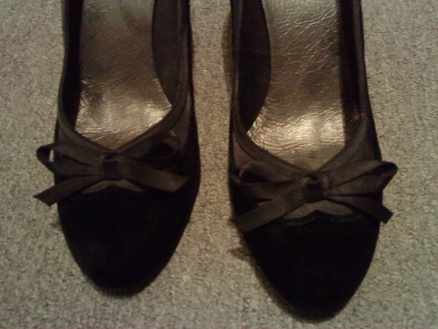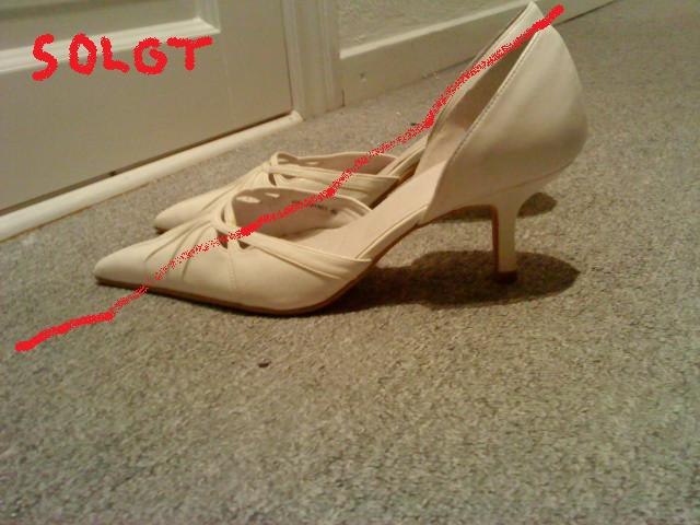Nr. 2: elour/satin med høje hæle og sløjfe. Str. 40. Adrig brugt. Nypris 350. byd.