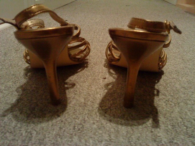 Nr. 6: Rem stiletter. Aldrig brugt i guld/kobber. Str 40. Nypris 300 kr. byd.