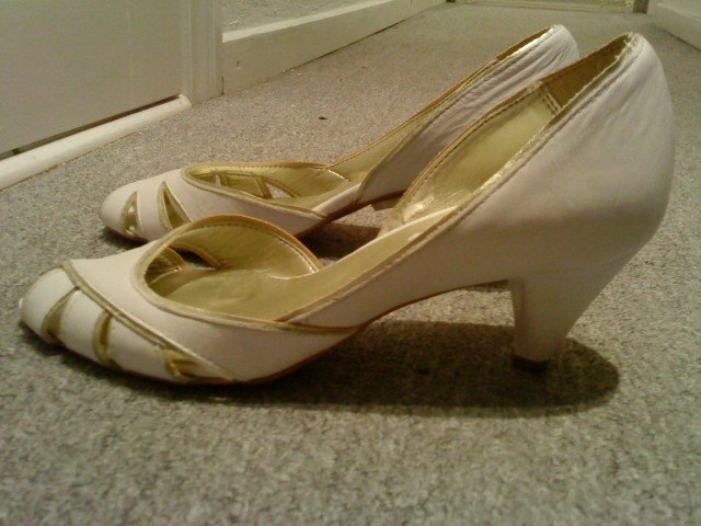 Nr. 7: super søde hvide pumps med guld kanter. Aldrig brugt. Str. 40. Nypris 400 kr. byd.