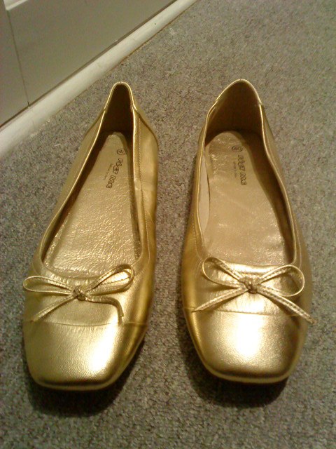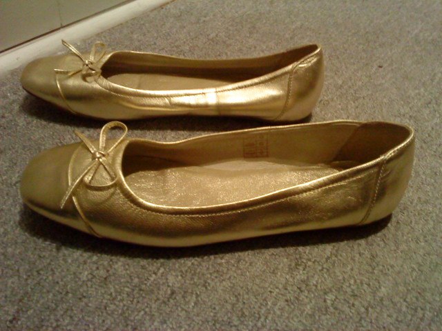 Nr. 13: "Feet Me" guld ballerina. Aldrig brugt. str 40. Nypris 400 kr. Byd.
