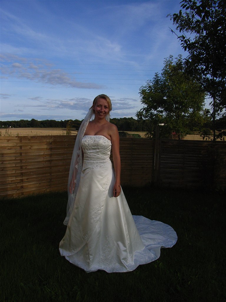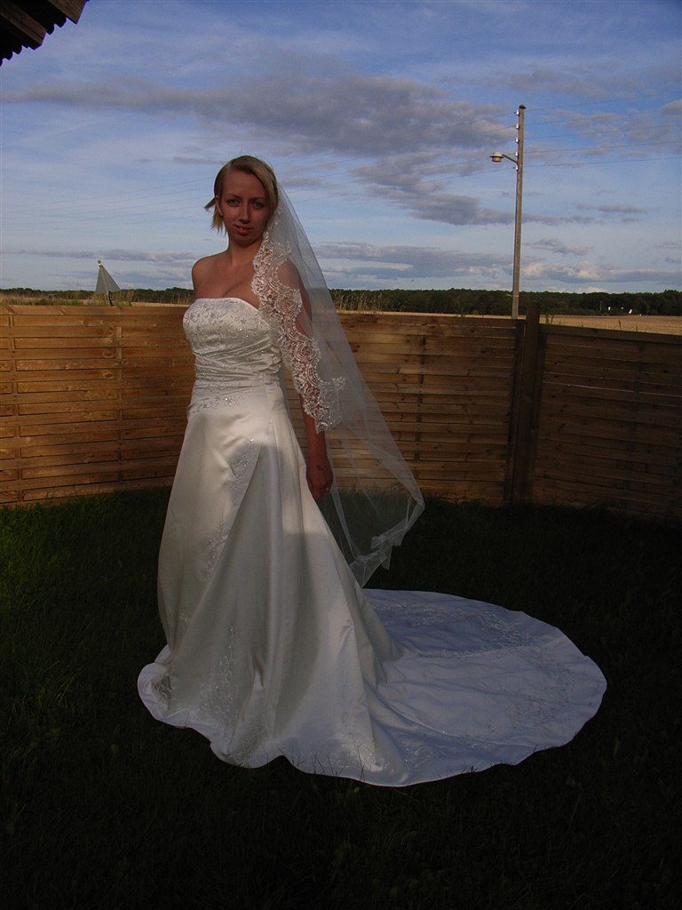 Den er brugt 1 gang, der medfølger underskørt, og et slør som skal lave om til et kort, hvis man gider det..