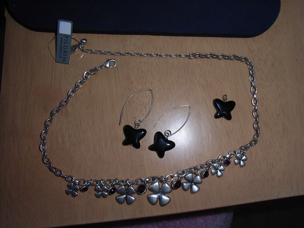 Hehe. kan godt se billedrne snyder lidt... det er en halskæde, den med de lilla sten og kløverne, og øreringene er ikk blade, men sommer fugle...