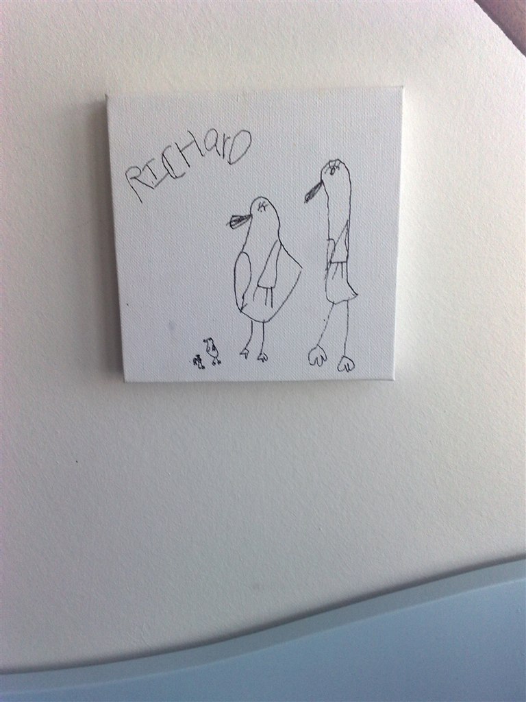 Det lille pingvin billede har Kirstine tegnet og skrevet Richard på. Det er Mikkel, mig, Kirstine og Richard, plus Richards lille bitte pingvin-bamse