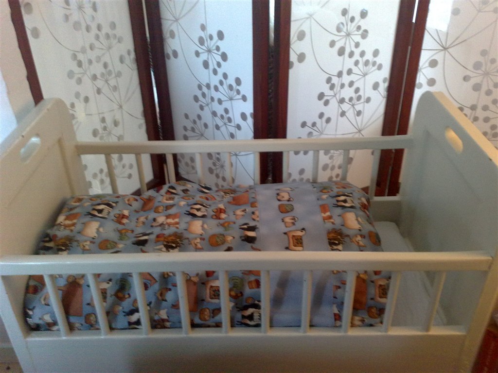Vugge-sengen er 100 år gammel og min oldemors far, der var snedker, har lavet den til min oldemor. Så har næsten alle unger i familien sovet i den som spæde lige siden. Den var originalt en vugge men mederbe blev fjernet engang i 70'erne da man dengang mente at vugge-bevægelser var fy fy. Derfor har sengen nu små skæve ben, he he...