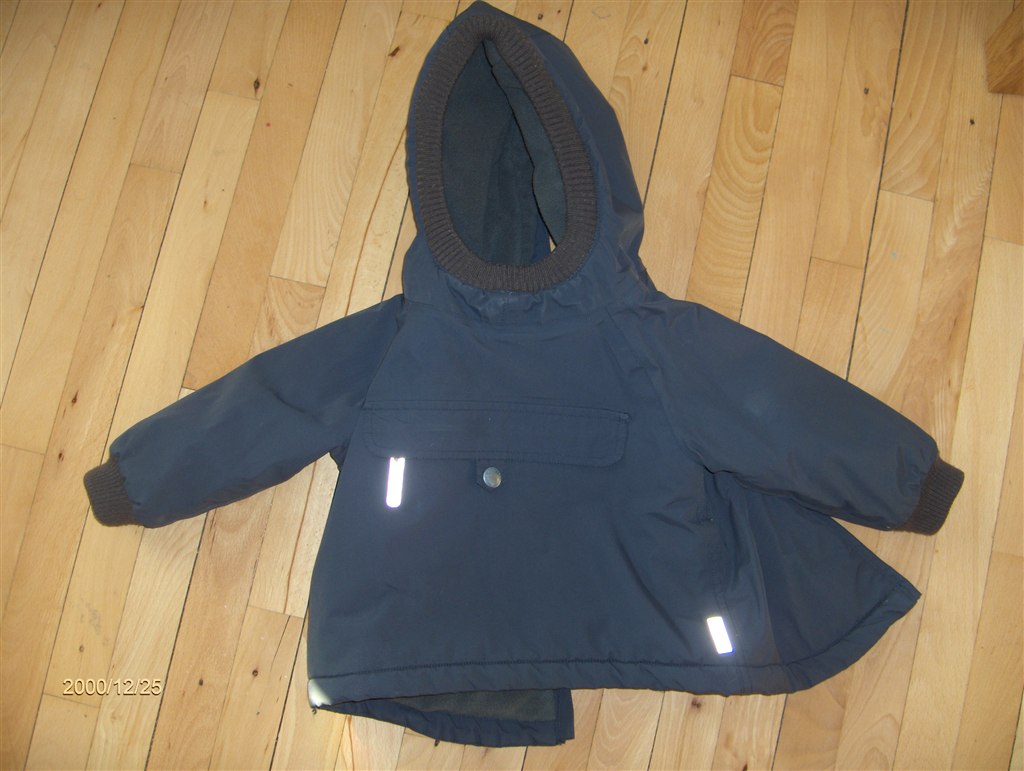 Jakken er også brugt og igen ses det med fnuller i ribkanterne. Ydermere kan man se på knappen på forlommen at den er ridset. Der er ingen huller eller anden slid. Den er str 9-12 mdr/ 80 cm
