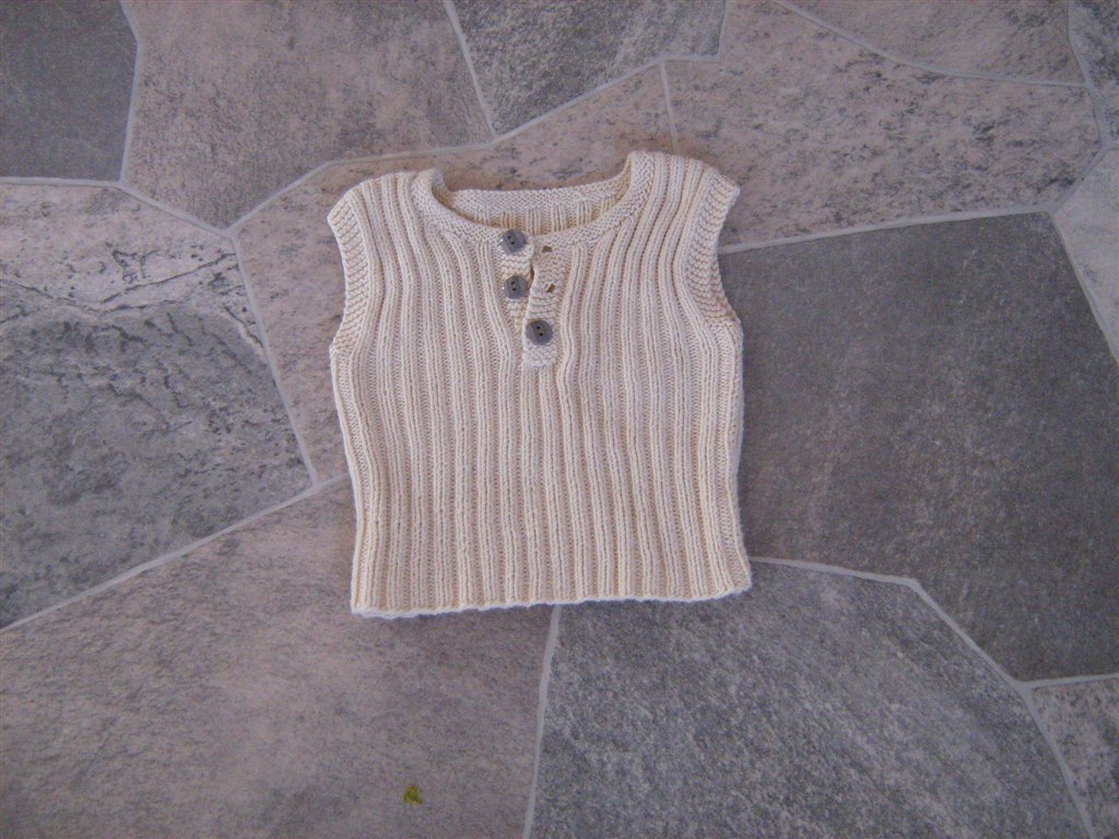 billed 1) Hjemmestrikket vest længde fra skulder og ned 26 cm - 20 kr.