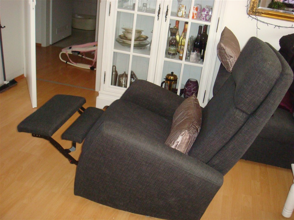Lækker rummelig stol, kan vippe, dreje og slås ud til 'læggestol'.Kan afhentes i Silkeborg for 450 kr.