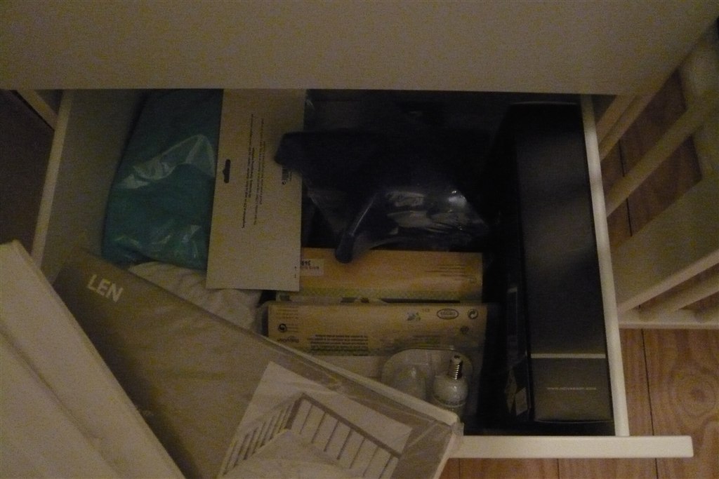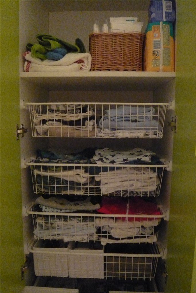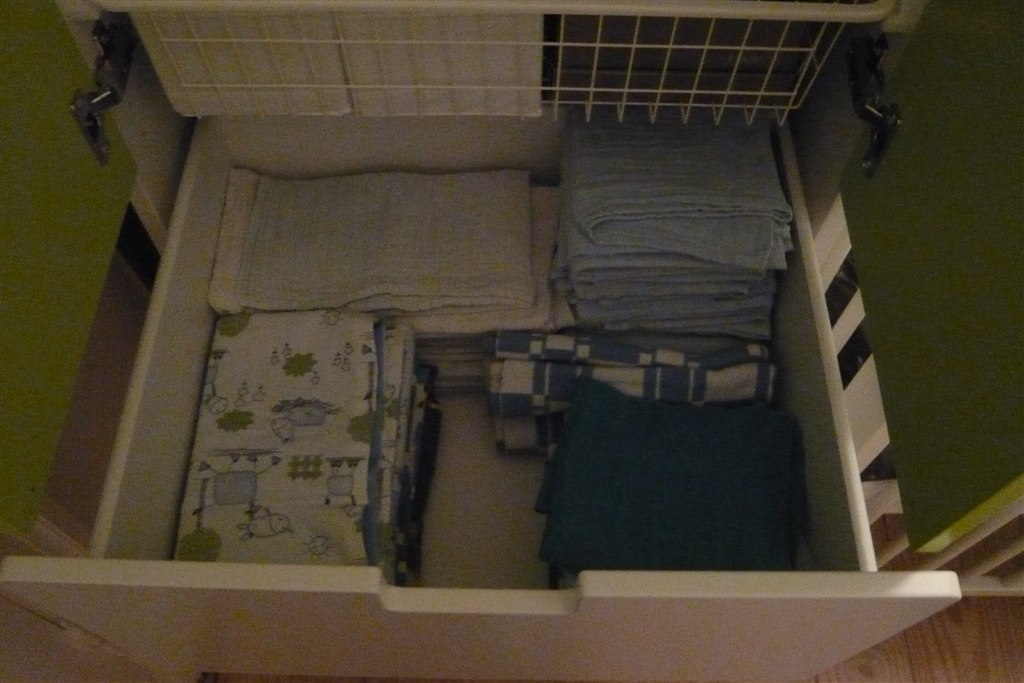 I skufferne (i skabet) har vi stofbleer, sengetøj og lagner, plus tilbehør til barnevognen såsom myggenet, regnslag og sele, samt babyalarm. Dejligt at få det væk - det har bare stået i poser, kasser og bunker over hele gulvarealet derinde...