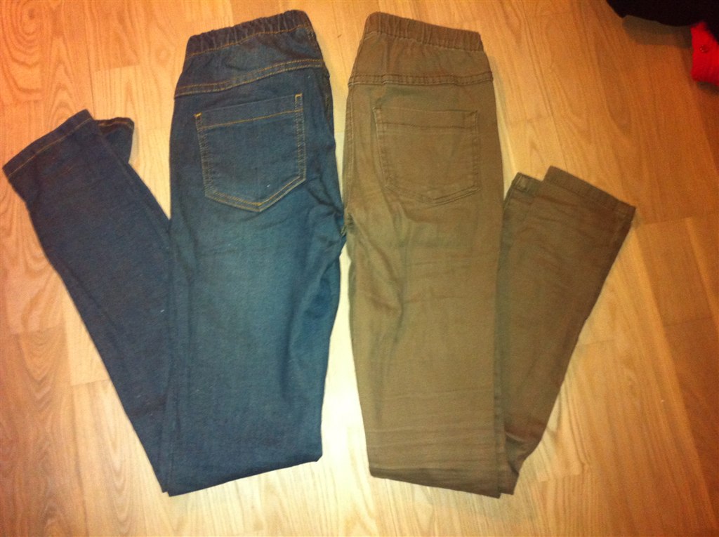 2. Jenas med elastik - også i taljen fra Pieces - mørke blå str. s/m brune str small. Fra ny 200-300 - sælges for 100 kr pr par.
