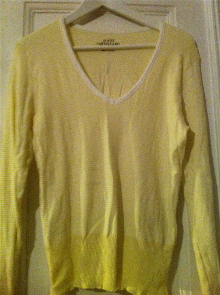 12 + 13. gul og hvid bluse fra Mads Nørgaard str medium - brugt et par gange - pris fra ny 500 ,- - sælges for 200 ,- (super lækker)