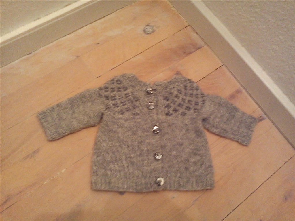 hjemmestrikket trøje i størrelse 62 ca eller lidt større. Min mor har strikket den. Den er lysegrå med mørkegråt mønster og perlemor (sølv/sort) knapper. Den koster 100kr.