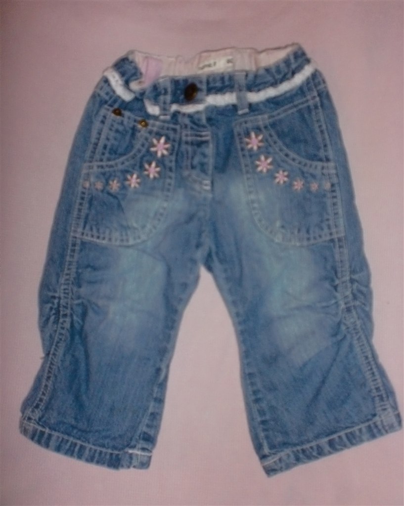 Smadder skønne cowboybukser fra "Name-It", størrelse 80.Med blomsterformede baglommer og flot blomster-dekoration på det ene bukseben = 40 kr. - SOLGT!