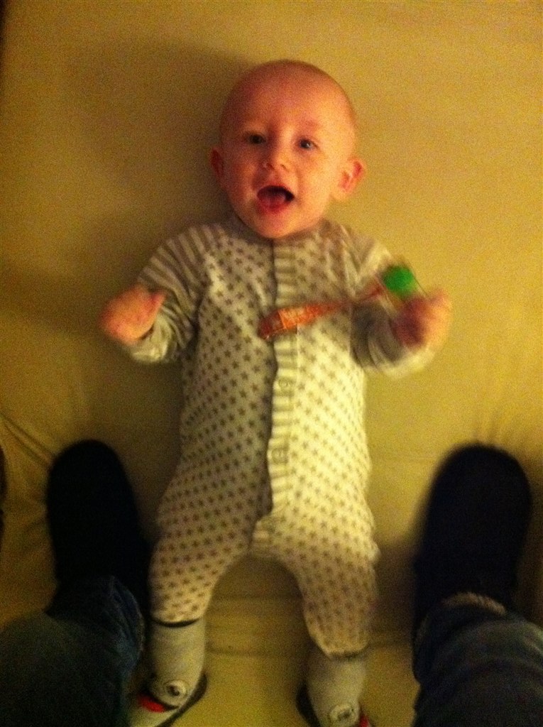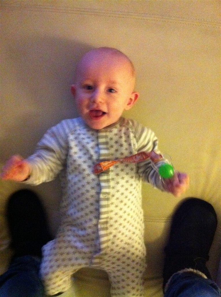 Personalet på stuen tog så Jonte mens jeg gik den "lille korte tur", og da jeg kom tilbage sad han ligeså frejdigt på gulvet med pædagogen og et andet barn og suttede på en træklods