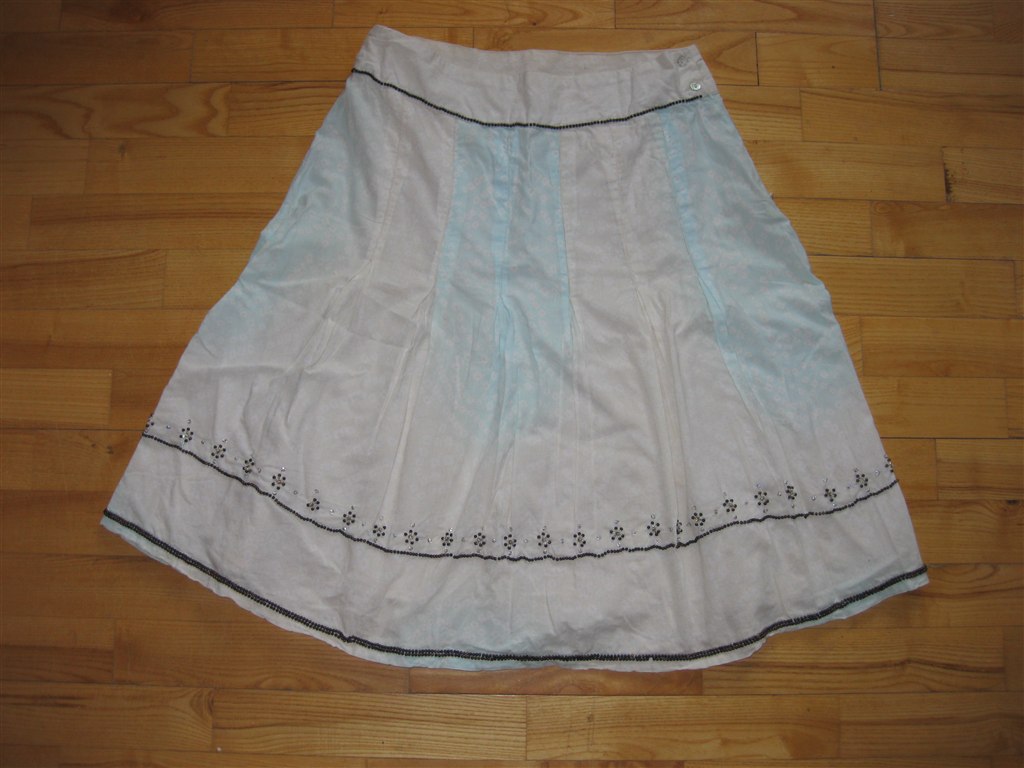 Billede 4: Hvid og lyseblå bomulds nederdel med perler og palietter. Fra Fransa, str. 36. God men brugt. Sælges for 50 kr.