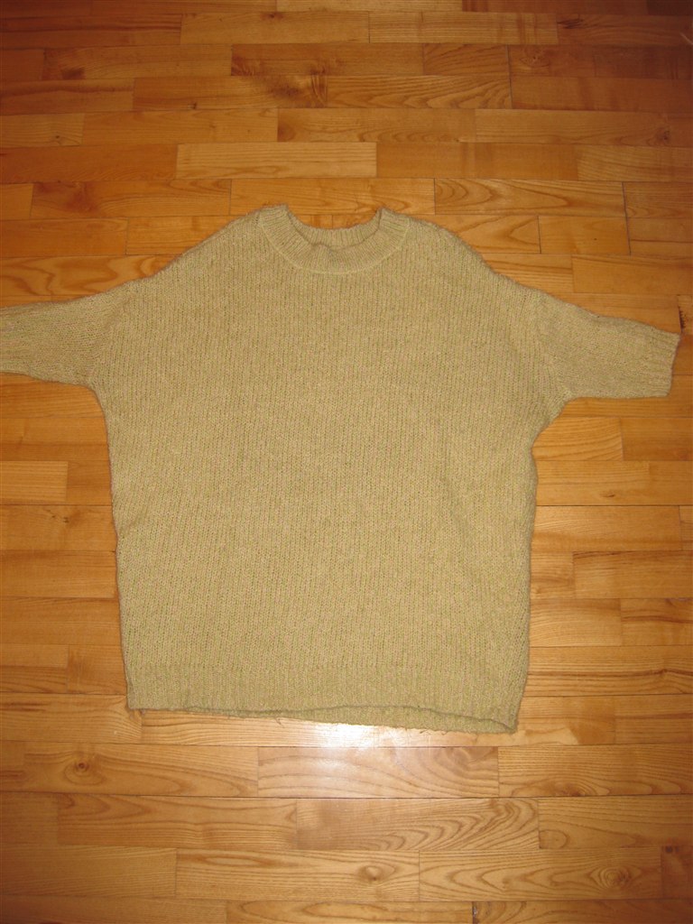 Billede 16: Støvet gul striktrøje med ¾ ærmer fra H&M str. M (akryl/uld/polyester/mohair). Plads til den gravid mave. Dejlig varm. God men brugt. Sælges for 40 kr.