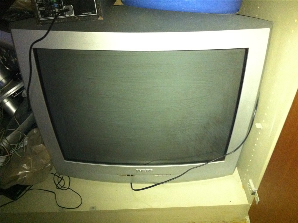Har et tv stående i skabet samt nogle blå væg lamper.