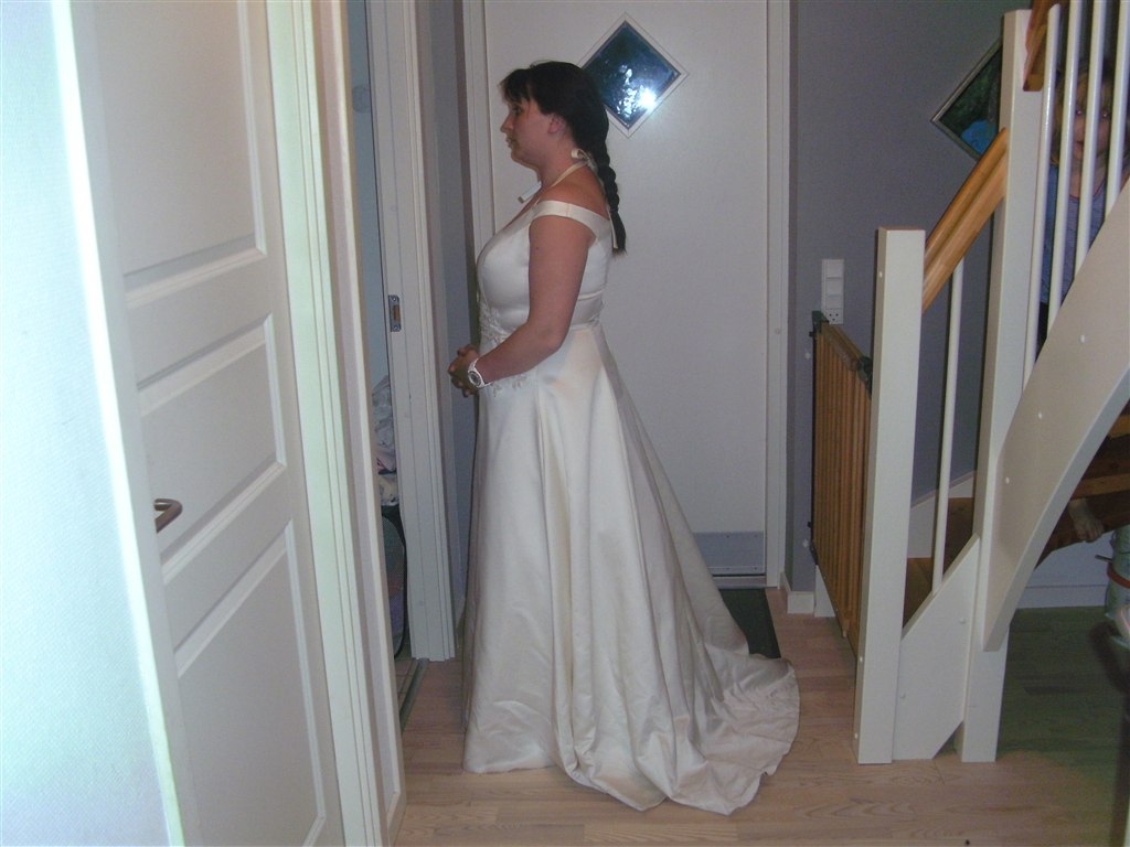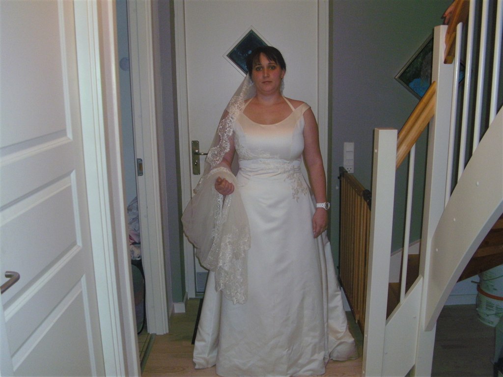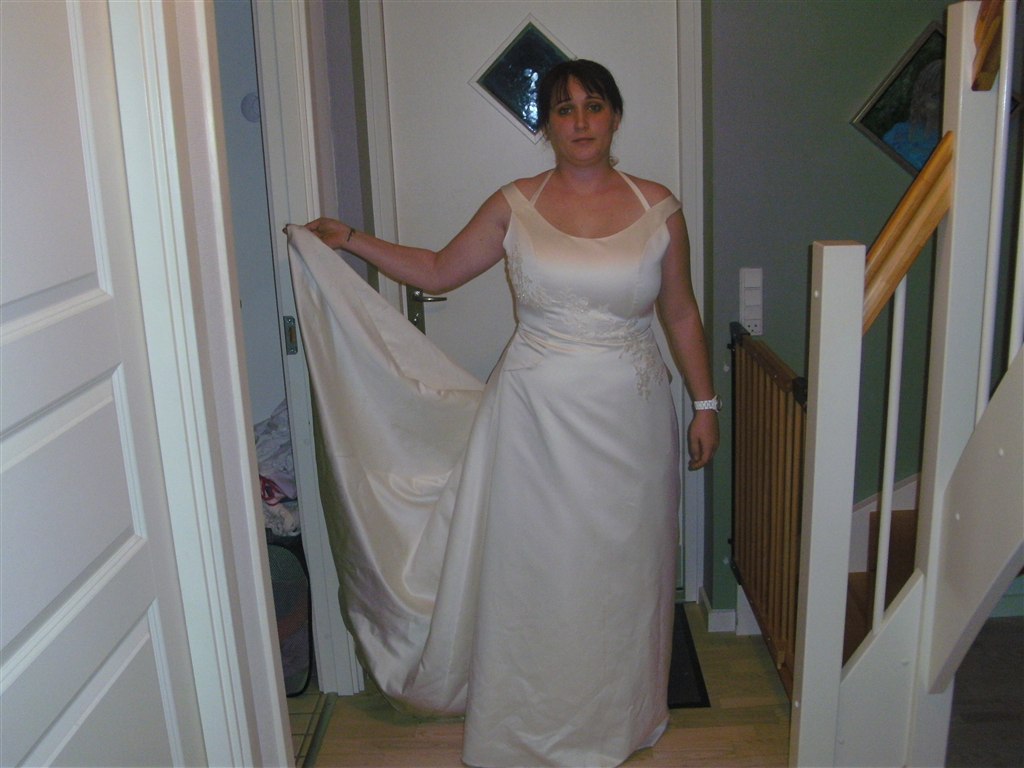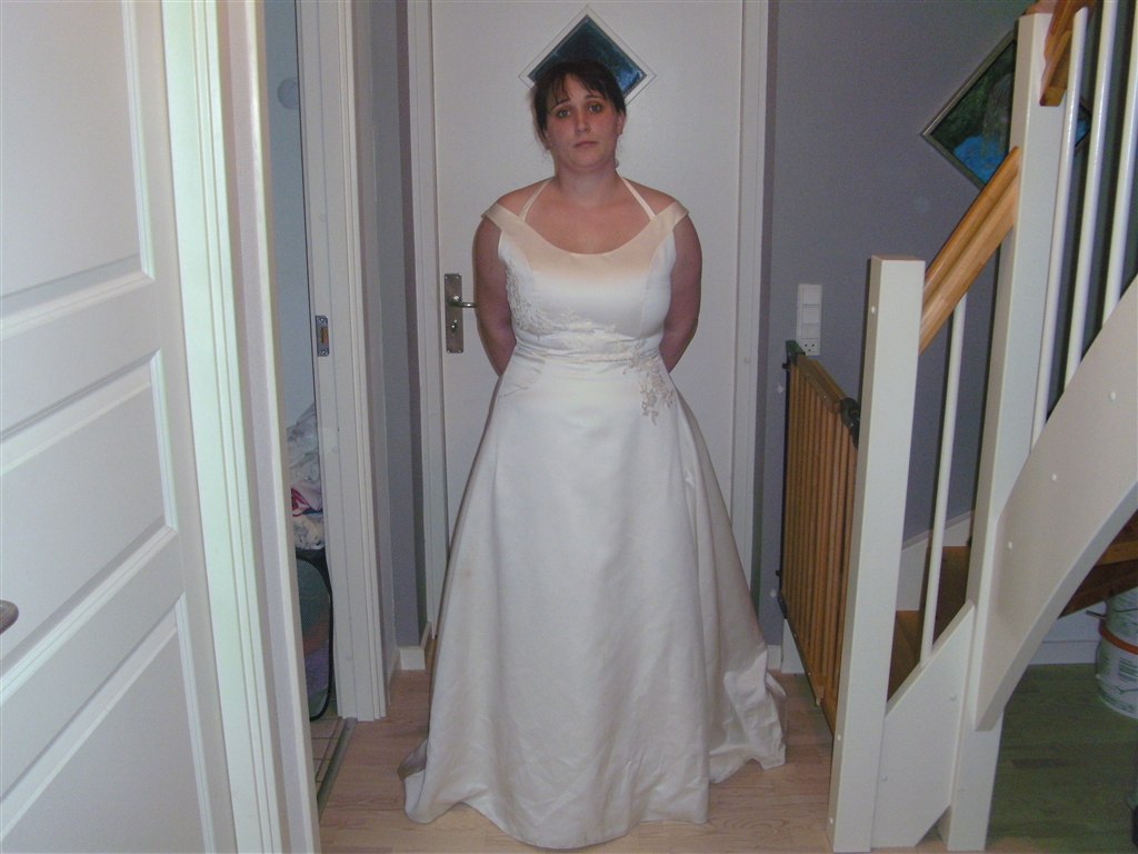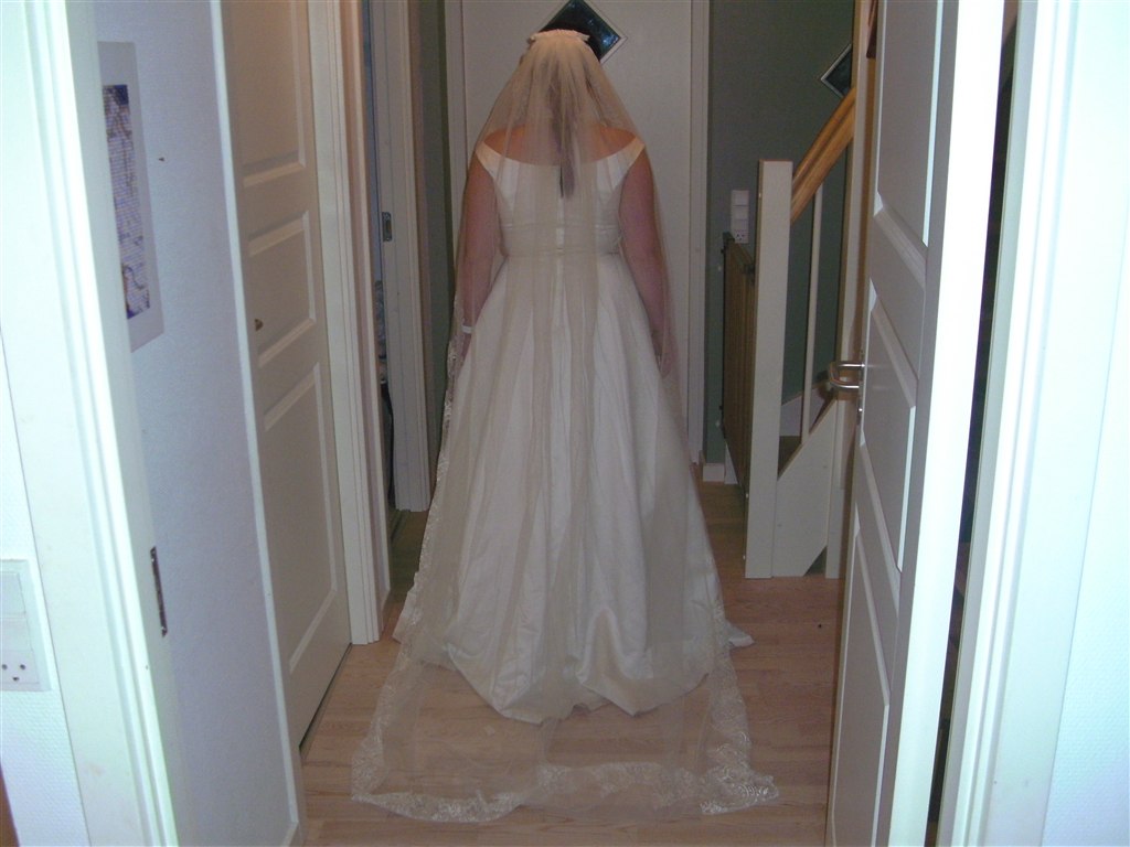 den har kun været brugt den ene aften, men den hænger jo og fylder i mit skab, og jeg har ingen planer om at skulle giftes igen.