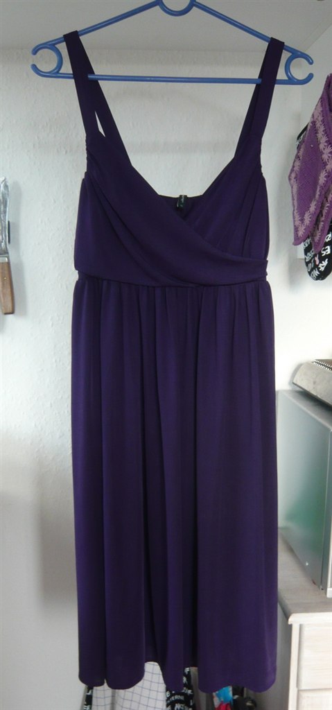 Lynlås i siden. Farven kommer ikke helt til sin ret på billedet, den er skinnende mørk lilla. Sidder rigtig pænt, da den falder pænt nedover kroppen, pga. snittet lige under brystet.
