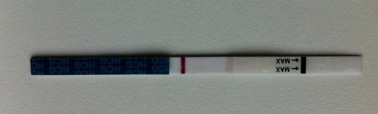 Jeg tog en ny test her til morgen, og der kom antydningen af en streg efter 2-3 minutter denne gang. Testen er blevet en hel del mere tydelig over tid. Men her er et billede af hvordan den så ud efter 4 minutter: