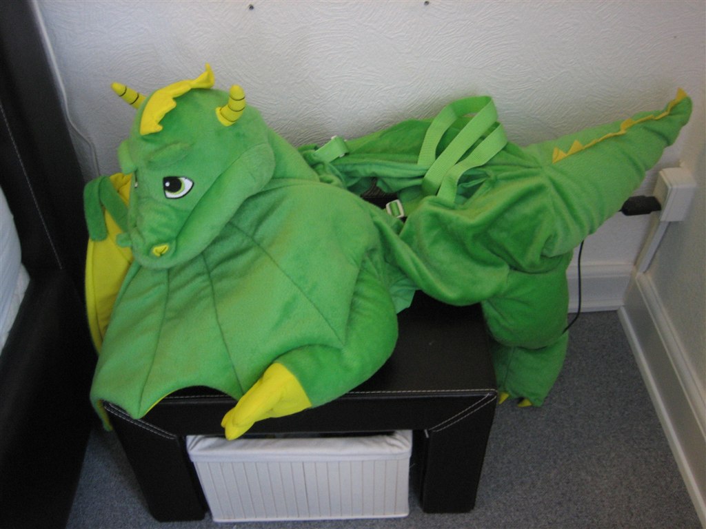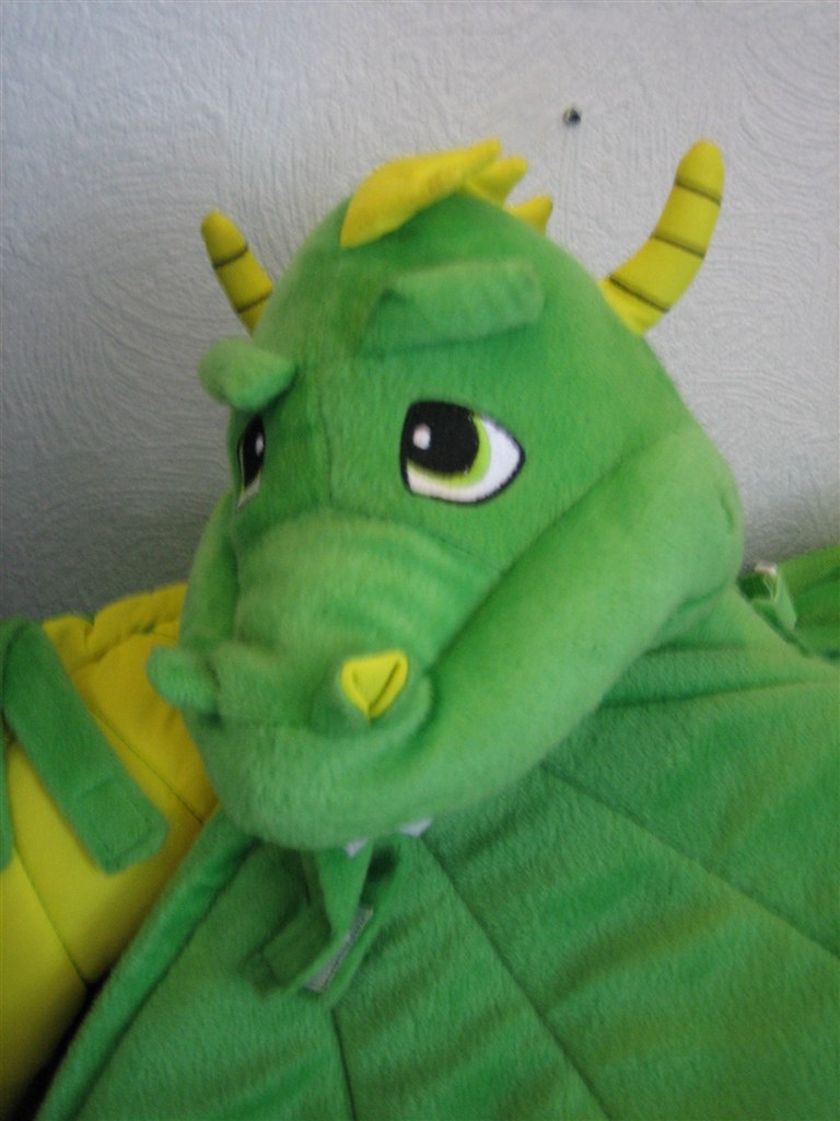 .. der er hul midt i dragen, og så hænger fødderne ned langs barnets ben, og vingerne kan man sætte på håndleddene så man kan "flyve" med den