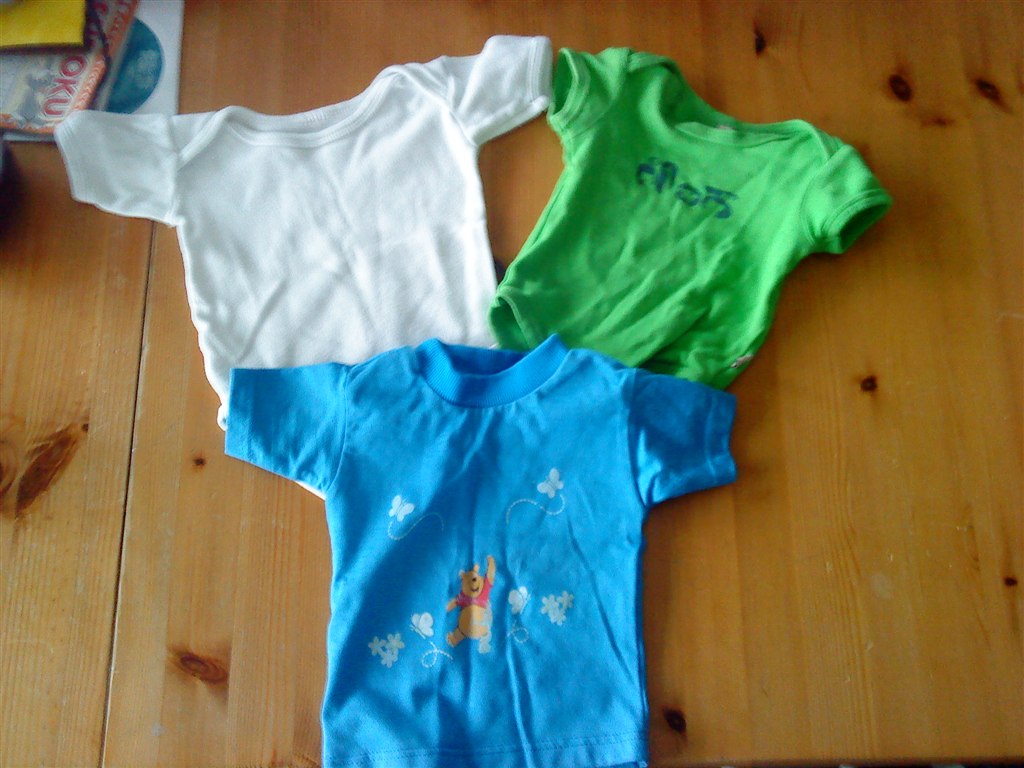 Billede nr. 5 - bodyer og én t-shirt str. 56. Mærker: Disney, Mads og Mette, Pippi.