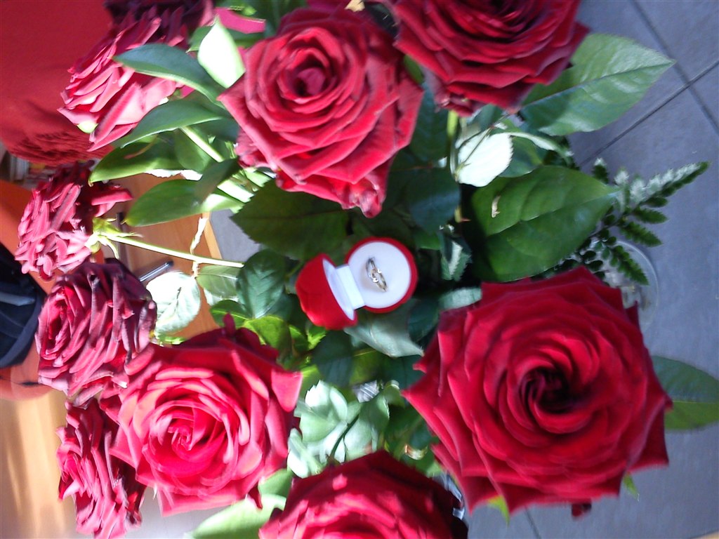 Resten af dagen hyggede vi, og lavede god aftensmad. Efter maden gik jeg så op for at putte Elina, mens Leon lavede dessert - og da jeg så kom hjem igen, var der lige pludselig 13 roser i buketten!! Og så gik han ellers på knæ, tog den 13., falske rose ud, åbnede den (for det var jo selvfølgelig en æske, forklædt som rose