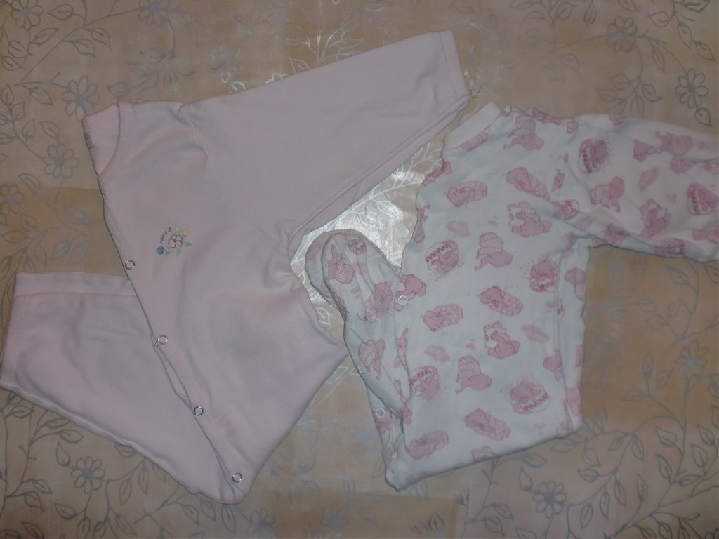 To natdragter i str. 80Til venstre - Lyserød med blomst på brystet (uden fødder) = 20 kr.Til højre - Med elefanter og dragt med fødder = 20 kr.