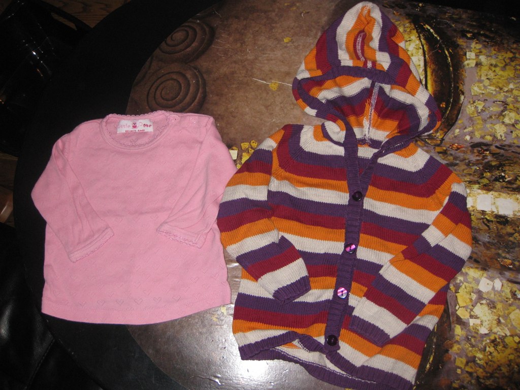 7: Lyserød bruse i str 62. Billede 8 er et nærbillede af stoffet. Hættetrøje i strik str 80