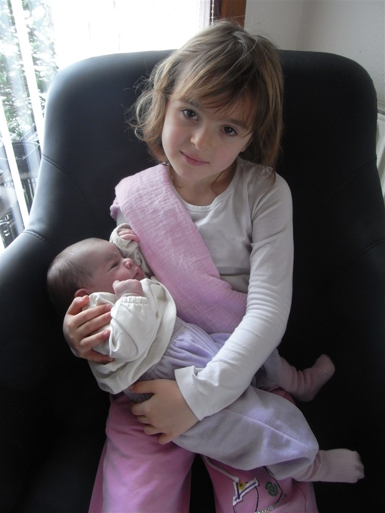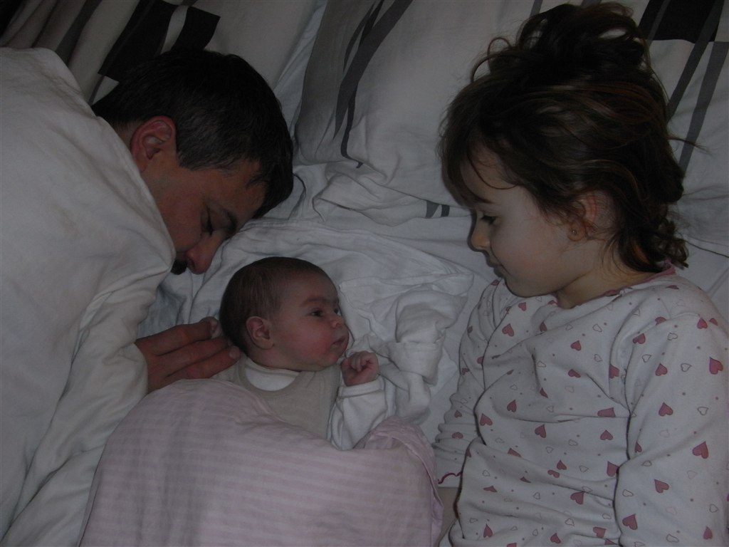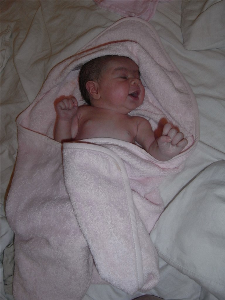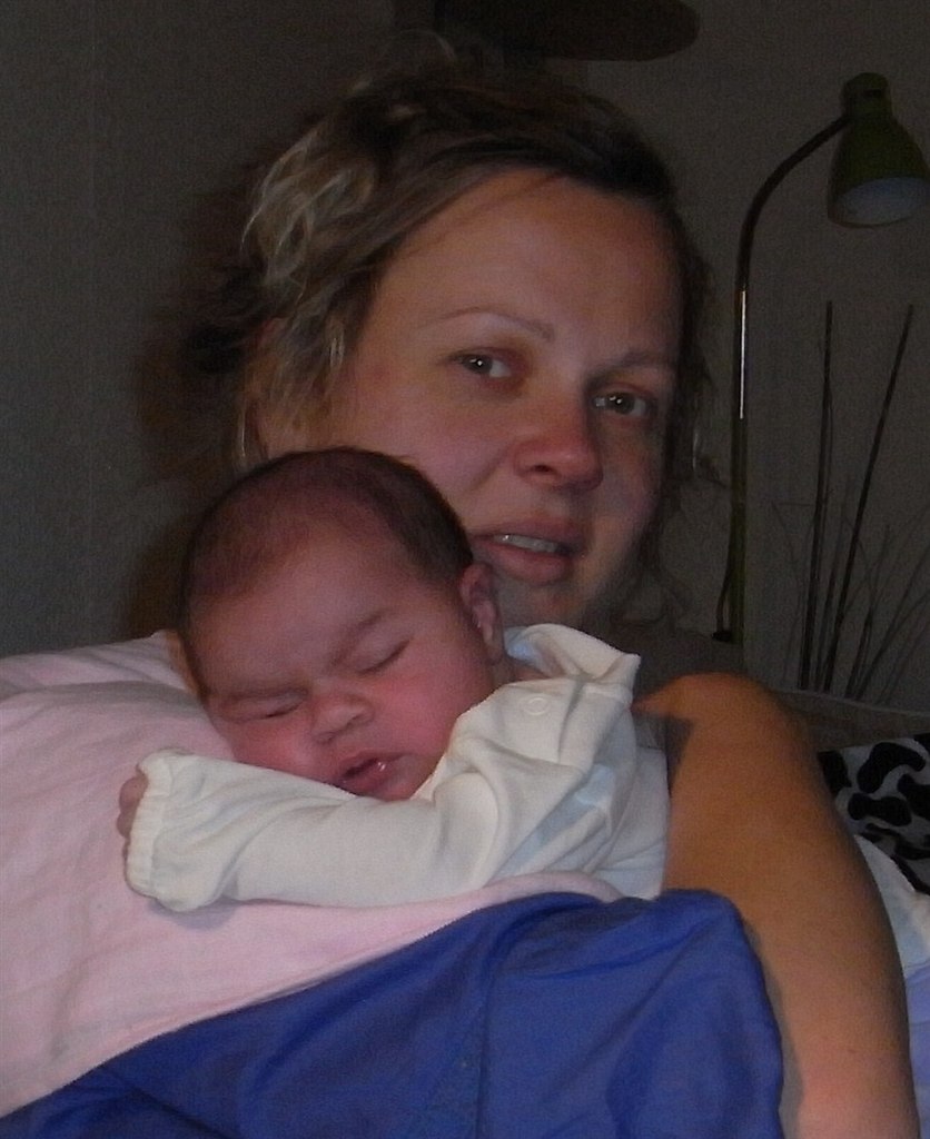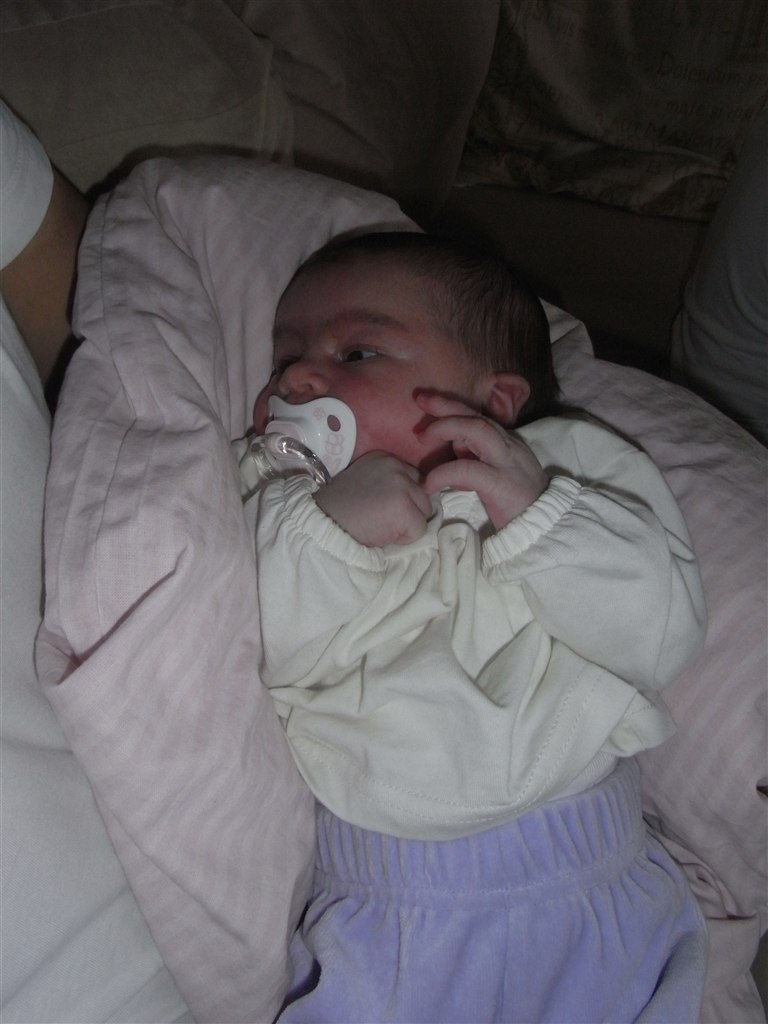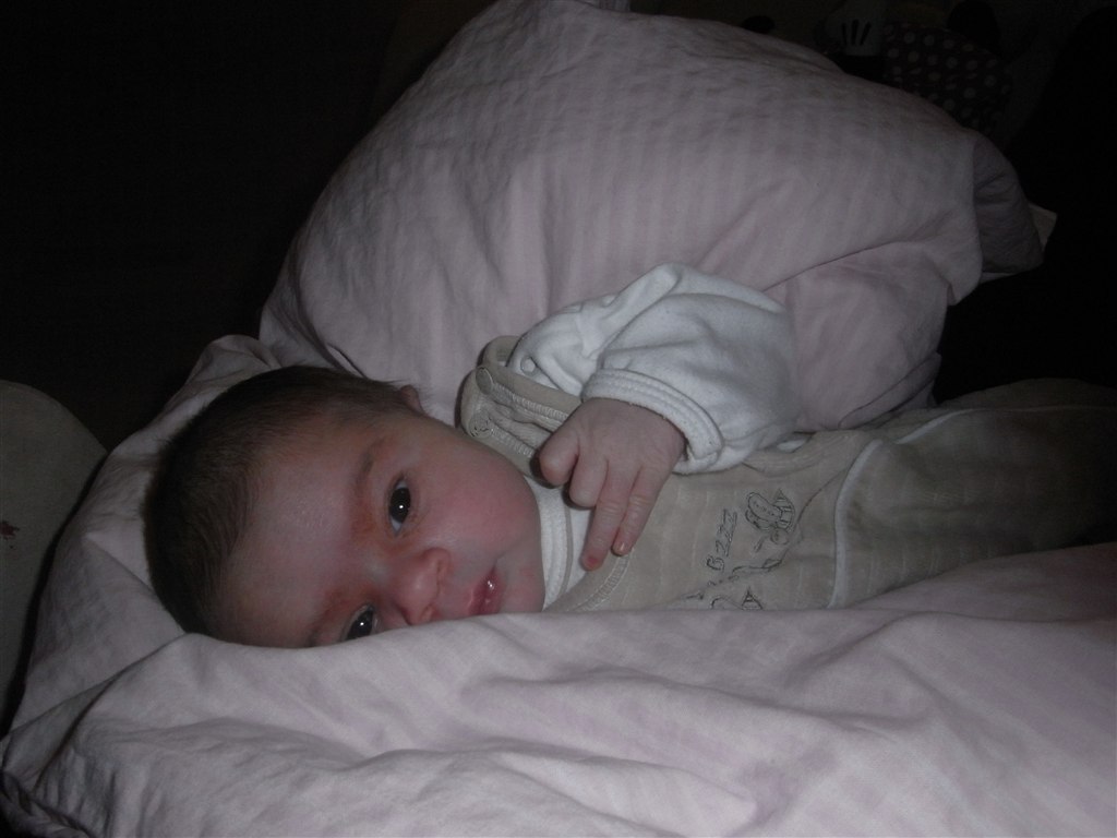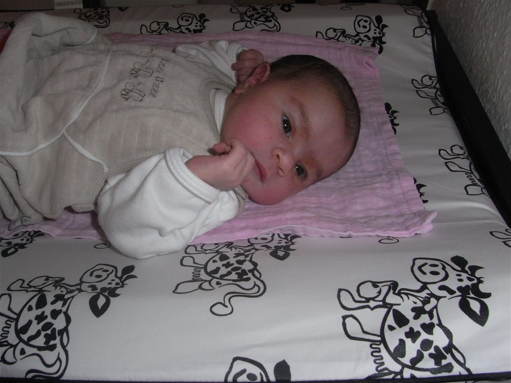 Hun er rigtig sød og nem - lige bortset fra de først 1½-2 døgn, hvor hun græd meget og bare ville ligge ved brystet konstant døgnet rundt, fordi hun var sulten. Hun havde højst sandsynligt brugt sin madpakke pga. de to uger, jeg gik over.