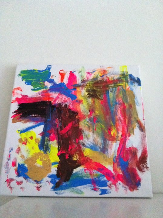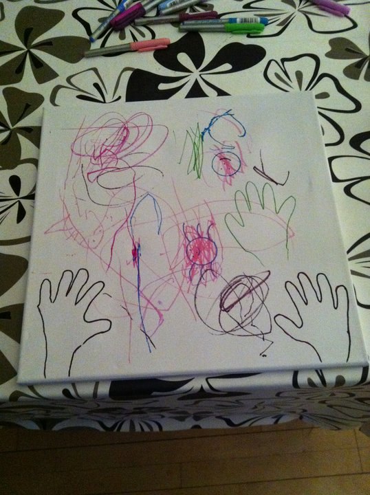 Han har så tegnet på et malerlærred, hvor der er 3 håndaftryk på og en masse streger
