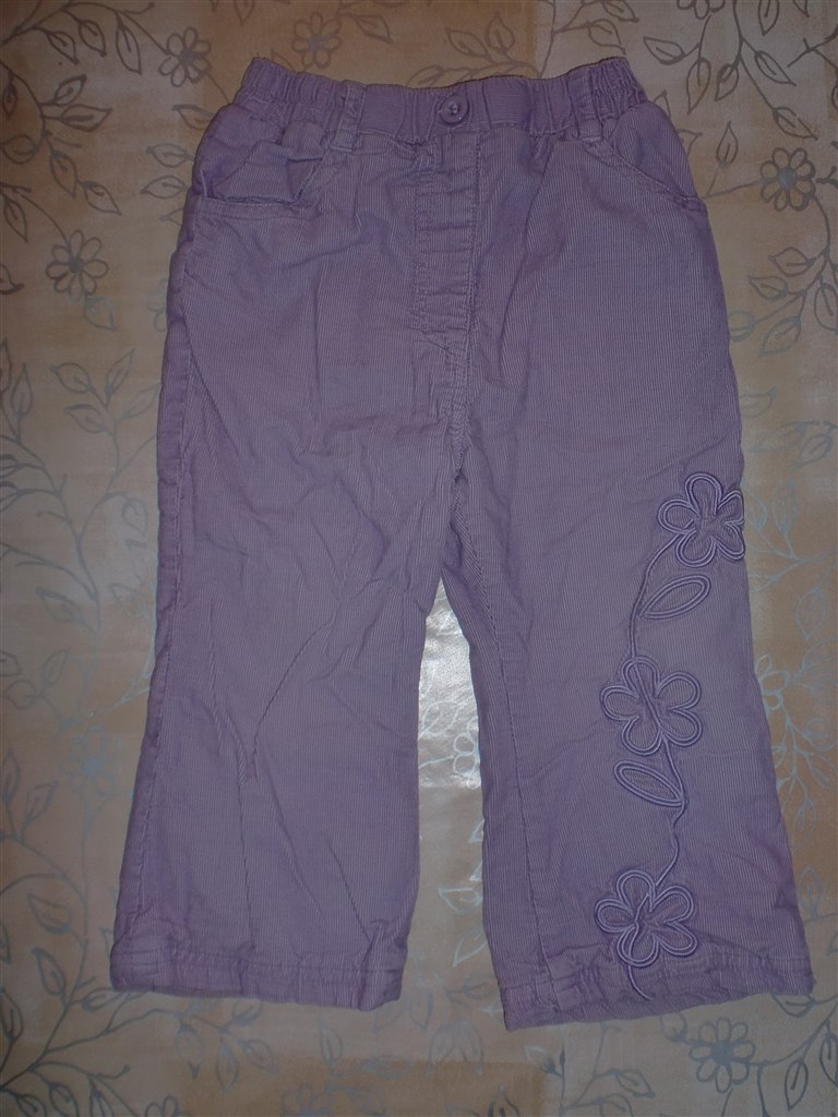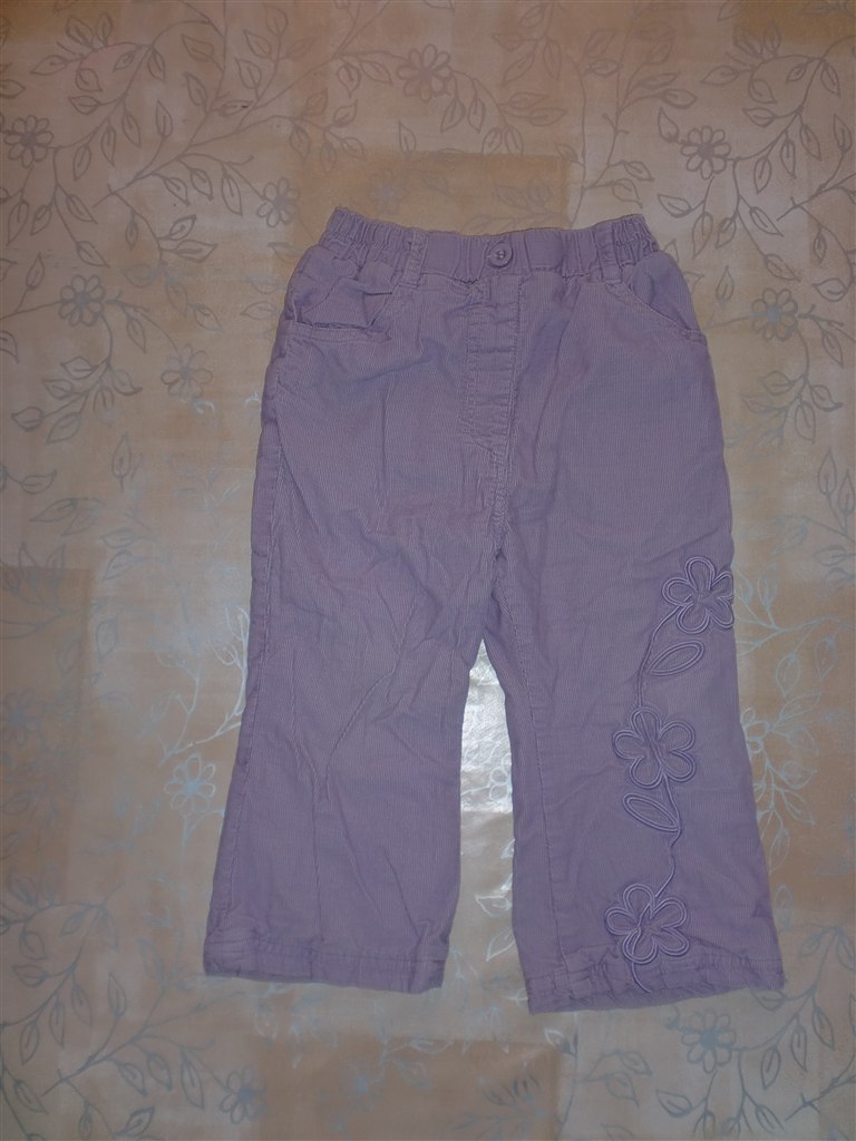 Bløde lilla bukser med blomster på det ene bukseben = 30 kr.