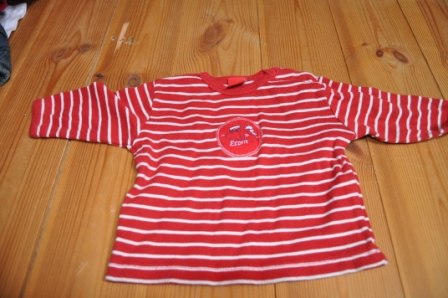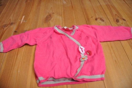 Cardigan fra Petitbom str. 68 med striber på ryggen. 35 kr.