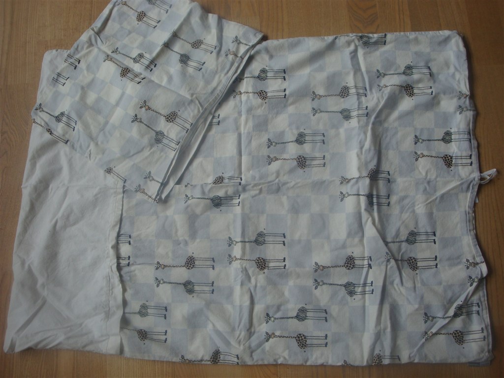 Jeg har en fra babydan med blå tern og giraffer... der følger sengetøj med... tænker det skal koste 150
