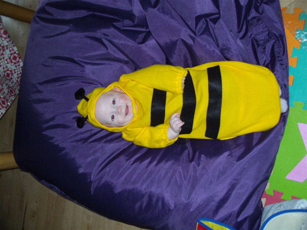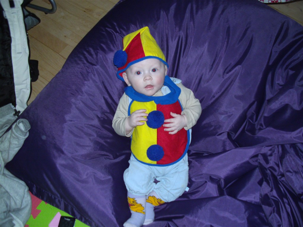 Min veninde i klassen har syet to par strømpebukser sammen, så hun får et grønt ben og et orange ben. Så får hun en kjole på, hvor jeg syr nogle lapper på, rottehaler og så får hun et par fregner