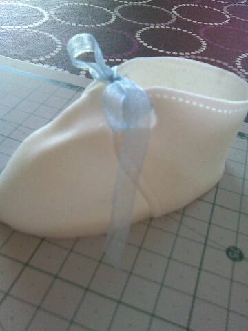 Laila T skriver: Så fik jeg taget mig sammen til at prøve at lave en baby sko. Det var smadder sjovt. fik dog rullet fondanten liiiidt for tynd.