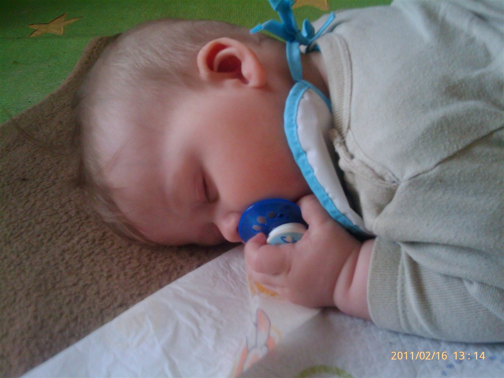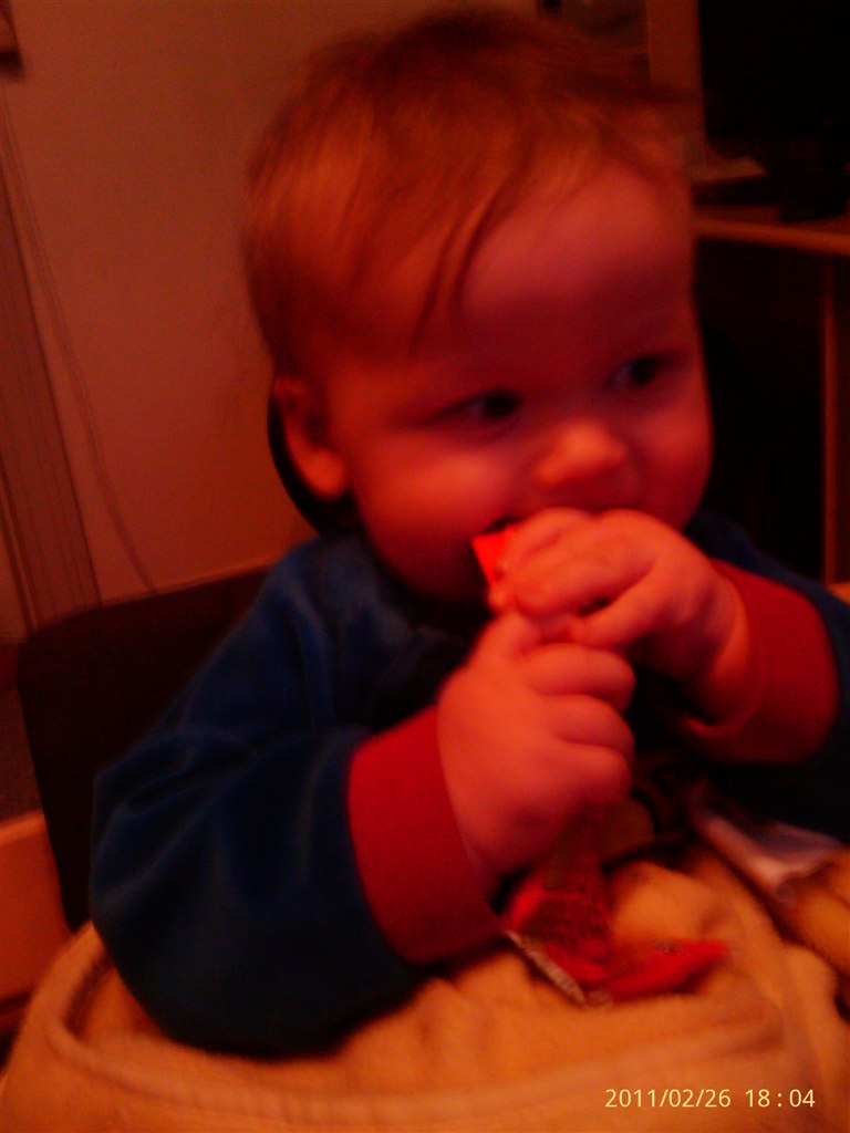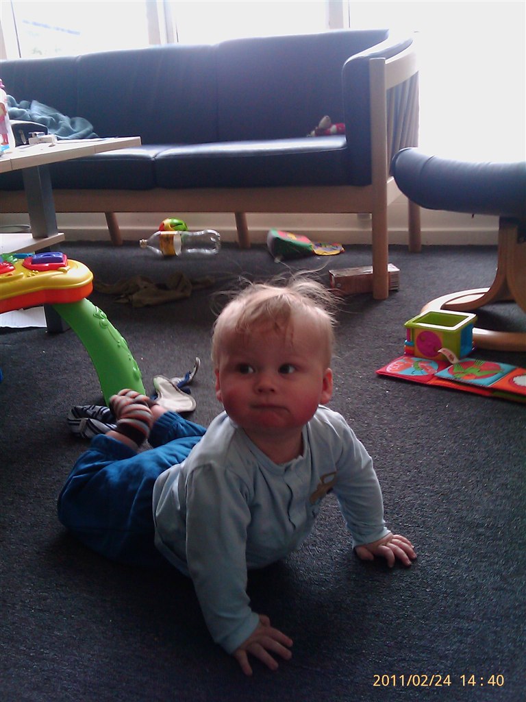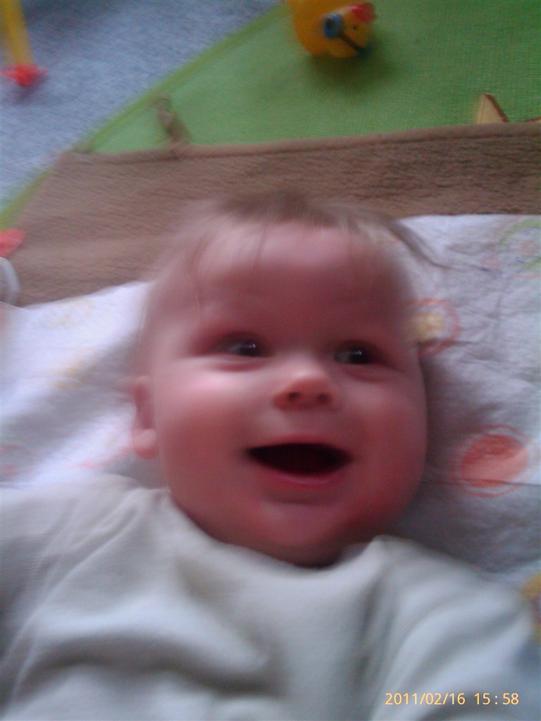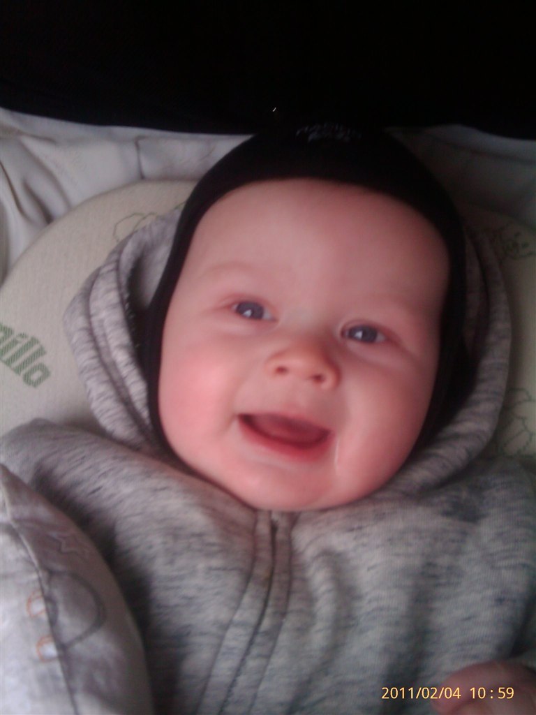 Han er begyndt og skubbe sig frem men prøver og og kravle. han er en rigtig lømmel, han kan godt li hans fars bass under computeren, og ligeså snart far skælder ud ligger han og griner og smiler