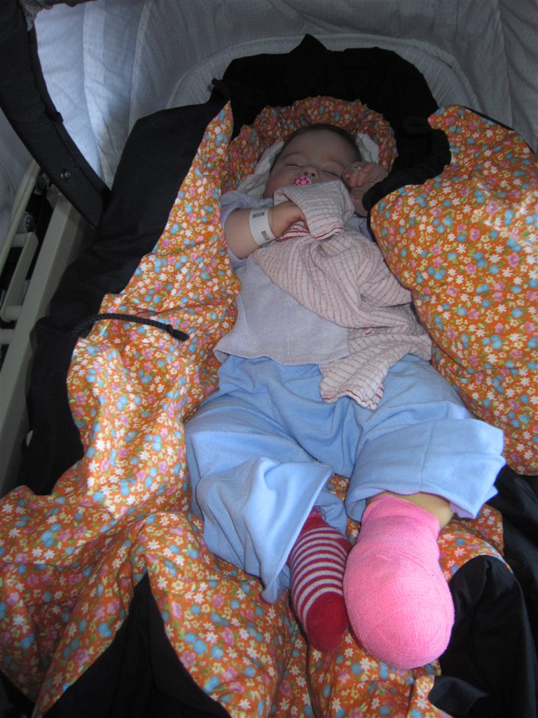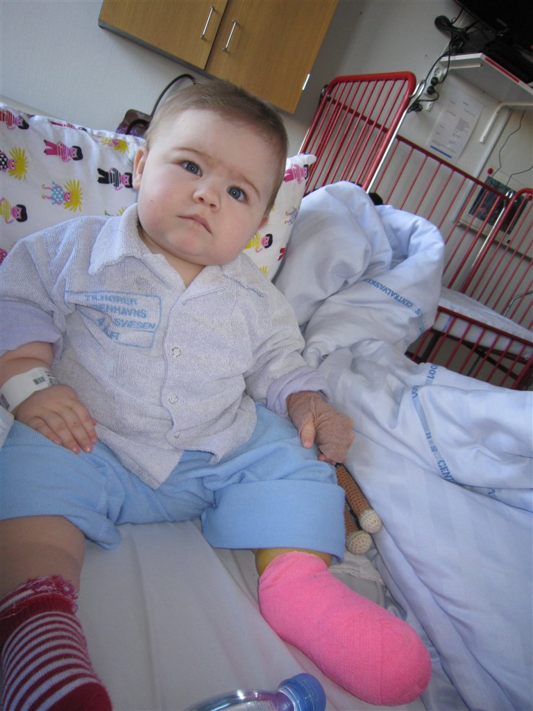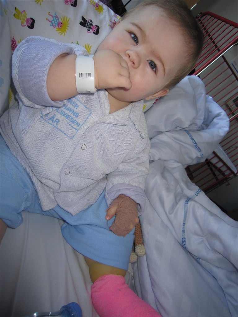 Da der var gået 2,5 time kom de og sage at nu lå hun på opvågningen og vi måtte gerne gå der ned. Da vi kom de ned lå hun og sov. Hun sov endnu 1 time og så skulle vi prøve og vække hende. Jeg aede hendes hånd og hun vågnede med det samme, vi var forberedte på at hun ville skrige, men hun smilede bare og har lige siden bare været et stort smil. Hun har ikke grædt en eneste gang, og har bare været så utrolig dygtig. Efter hun havde spist, drukket, tisset, fjernet drop og fået taget endnu et røntgen foto er vi nu endelig kommet hjem. Det har været rigtig hårdt, men hold op hvor er det skønt at nu er det overstået. Den store forbinding skal hun have på indtil til fredag, hvor vi skal til læge og have lagt en mindre forbinding.