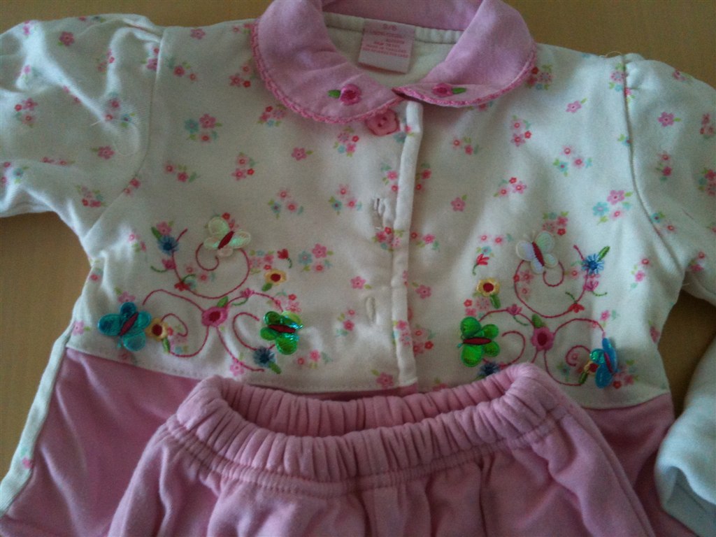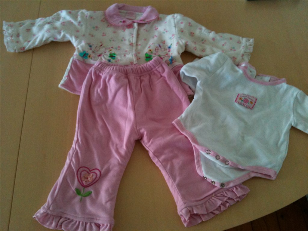 Sødt pigesæt med body, cardigan og bukser i str. 74. Mærket er ukendt. Sættet har været brugt en gang og vasket i Neutral to gange.