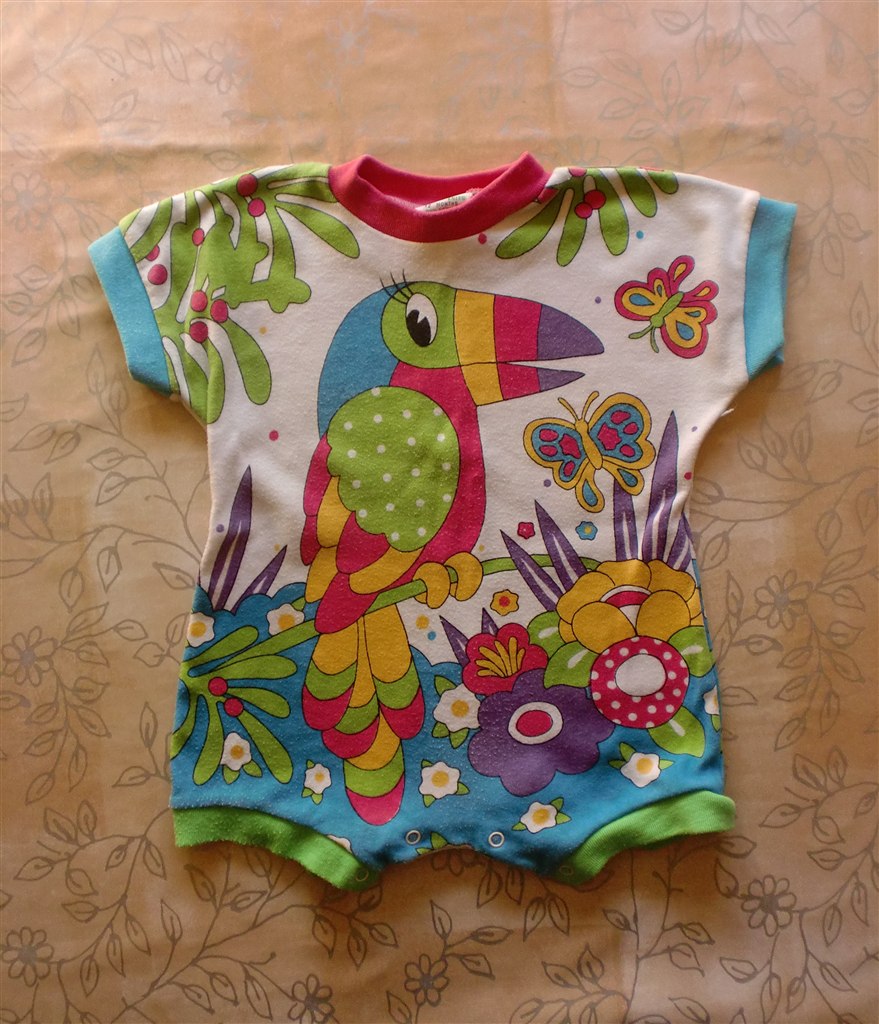 Herlig sommerdragt med papegøje fra "Confetti", str. 12 mdr. = 25 kr.