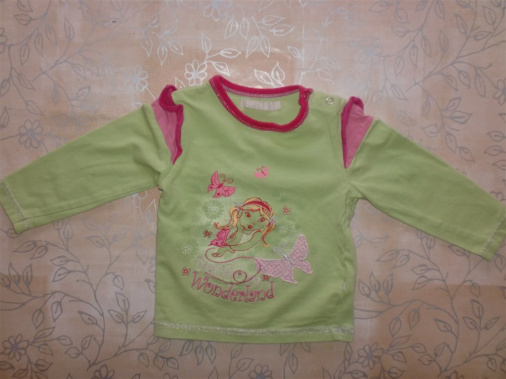 Grøn trøje fra "PetiBom" med motiv af pige + blomster/sommerfugle = 25 kr.