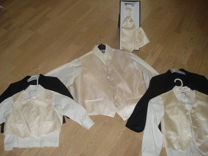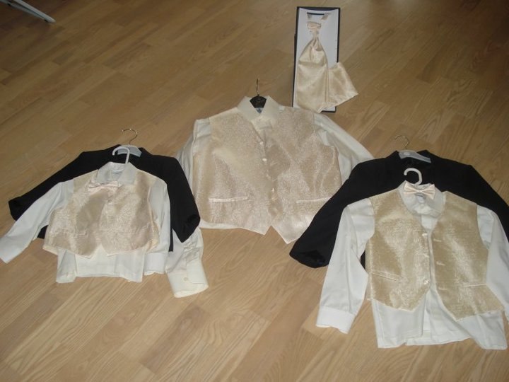 Pæn brudekjole, tøj til gommen plus to sæt tøj mage til gommens til to drenge. Kjolen er en str. 40-42. Gommens vest er en str S, hans skjorte er en str. 38. Børnestøj er til en dreng på 2-4 år og 6-8 år. Skoen til børn er str. 25 og 32. Det hele slæges for 2.500,- Ring eller skriv for mere info eller billeder
