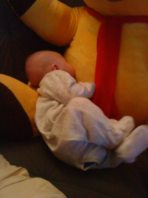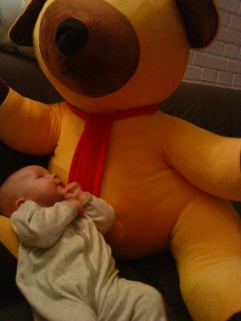 Jeg fik en GIGA bamse, fra bamse & kylling i barselsgave. Idag var Benjamin sammen med den for første gang. Her kommer lige nogle billeder.